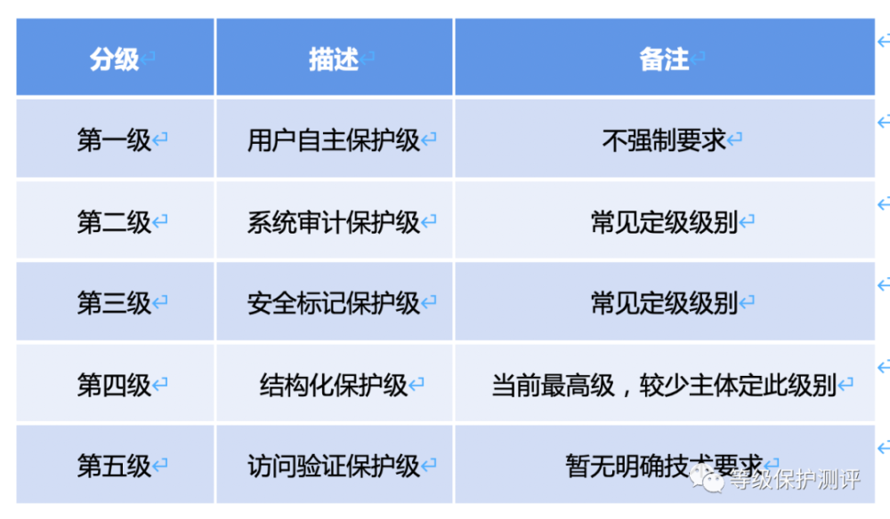 等級保護根據(jù)《GB 17859-1999 計算機信息系統(tǒng)安全保護等級劃分準(zhǔn)則》(網(wǎng)絡(luò)安全領(lǐng)域唯一一個強制標(biāo)準(zhǔn))規(guī)定共分五級,分別是: